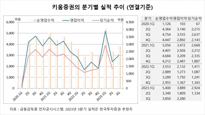 한국투자증권은 키움증권의 3분기 연결기준 순영업수익이 3850억원, 영업이익이 2280억원에 이를 것으로 전망했다.