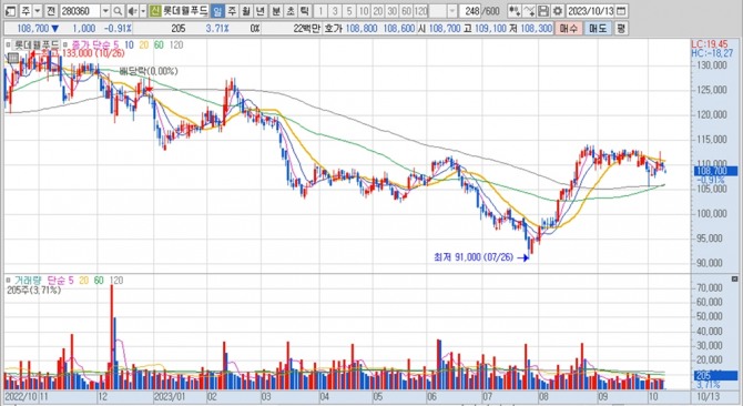 이미지 확대보기롯데웰푸드의 주가는 13일 오전 9시 20분 현재 전일보다 1000원(0.91%) 내린 10만8700원에 거래되고 있다.