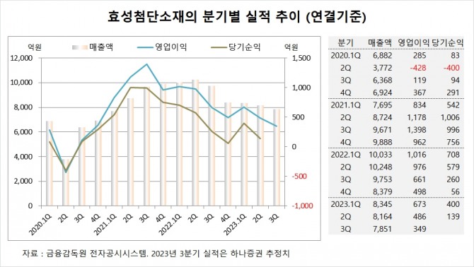 하나증권은 효성첨단소재의 3분기 연결기준 매출액이 7851억원, 영업이익이 349억원에 이를 것으로 내다봤다. 3분기 영업이익은 시장 컨센서스인 584억원을 하회할 전망이다.