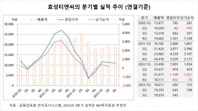 NH투자증권은 효성티앤씨의 3분기 연결기준 매출액이 1조8970억원, 영업이익이 545억원에 이를 것으로 전망했다.