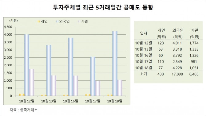 18일 공매도 대금은 전일보다 전체적으로 1716억원 급증했다. 공매도 비중이 높은 외국인이 4228억원으로 전일보다 1679억원 늘었다. 기관도 전일보다 70억원 늘렸으나 개인은 33억원 줄인 것으로 나타났다.