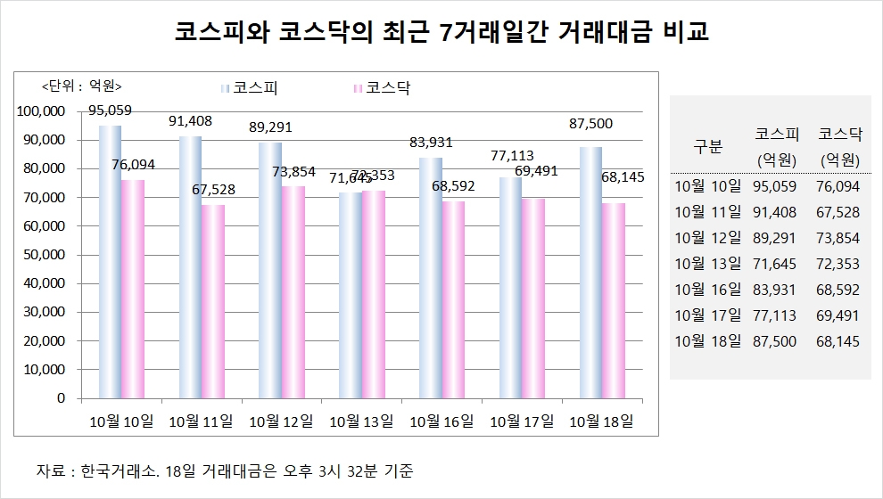 이미지 확대보기코스피 거래대금은 18일 8조7500억원으로 전일보다 1조387억원 늘었다. 코스닥은 전일보다 1346억원 감소한 6조8145억원을 나타냈다. 코스피 거래대금이 코스닥 거래대금보다 1조9355억원 많은 것으로 나타났다.