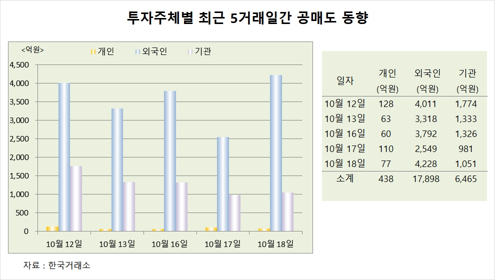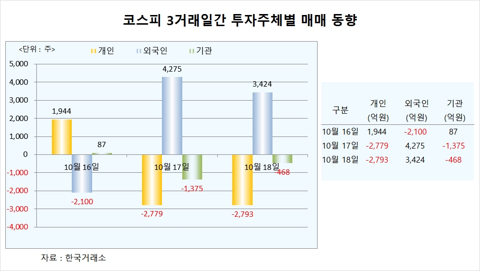 이미지 확대보기코스피는 외국인이 이틀째 순매수 한 덕에 이날 소폭 상승으로 마감했다. 개인이 2793억원, 기관이 468억원의 물량을 쏟아냈다. 외국인은 3424억원을 매수하면서 개인과 기관이 출회한 물량을 사들였다.