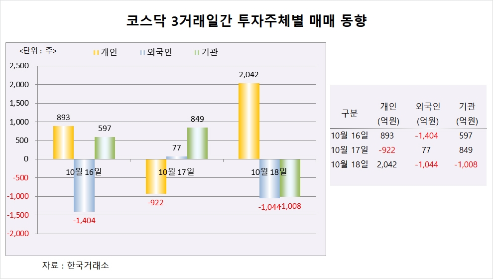 이미지 확대보기코스닥에서는 개인이 2042억원을 순매수했지만 지수를 방어하기에는 역부족이었다. 외국인운 1044억원을 내다 팔았고 기관도 1008억원을 순매도했다.