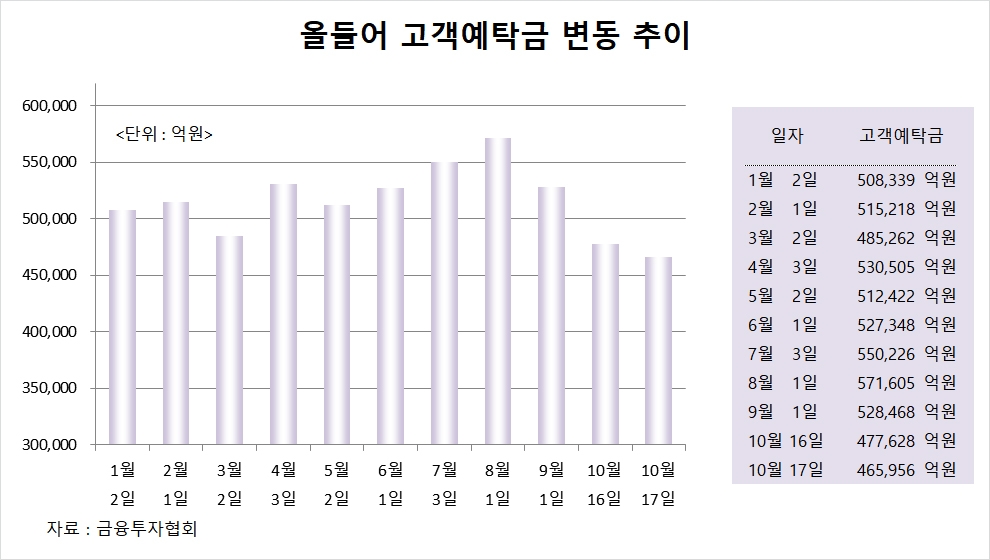이미지 확대보기고객예탁금은 17일 기준으로 46조5956억원으로 전일보다 1조1671억원 줄었다. 고객예탁금은 연초에 비해 4조2383억원 밑도는 수준으로 내려앉았다.