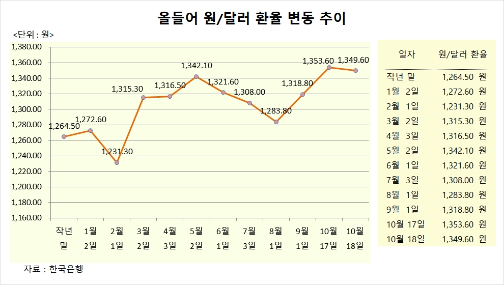 이미지 확대보기원/달러 환율은 18일 전일보다 4.00원 내린 1349.60원에 장을 마감했다. 원/달러 환율은 이날 전일보다 1.40원 상승한 1355.00원으로 출발했으나 상승폭을 반납하며 하락세로 돌아선 뒤 하락폭이 확대되며 마감했다.