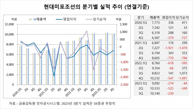 SK증권은 현대미포조선의 올해 연결기준 매출액이 4조1290억원, 영업이익이 -1000억원에 달할 것으로 추정했다.