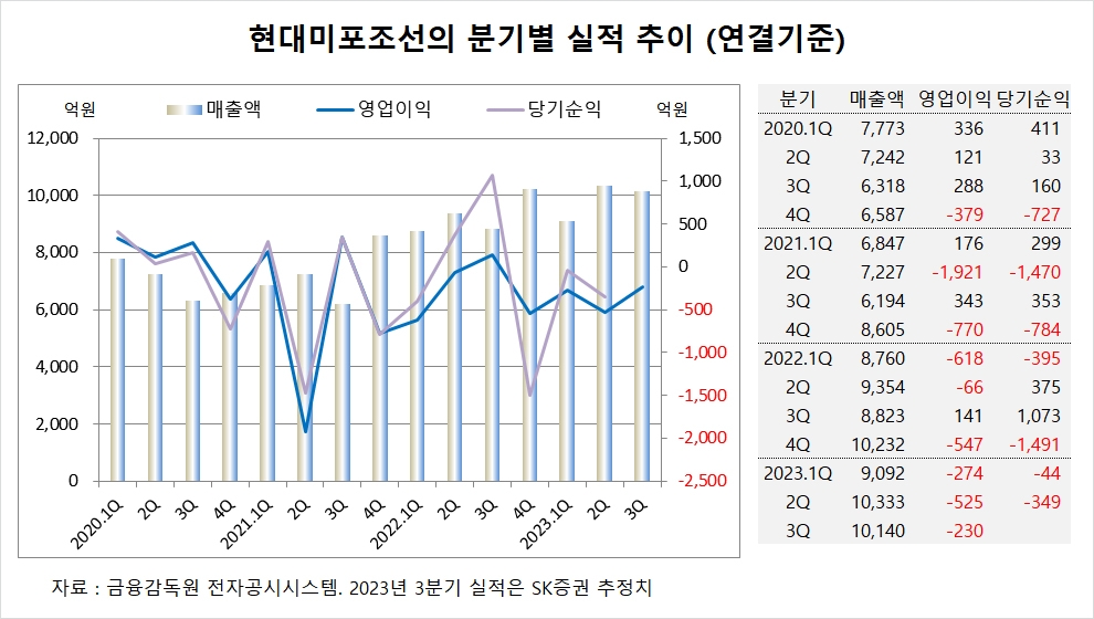 SK증권은 현대미포조선의 3분기 연결기준 매출액이 1조140억원, 영업이익이 –230억원에 이를 것으로 전망했다.