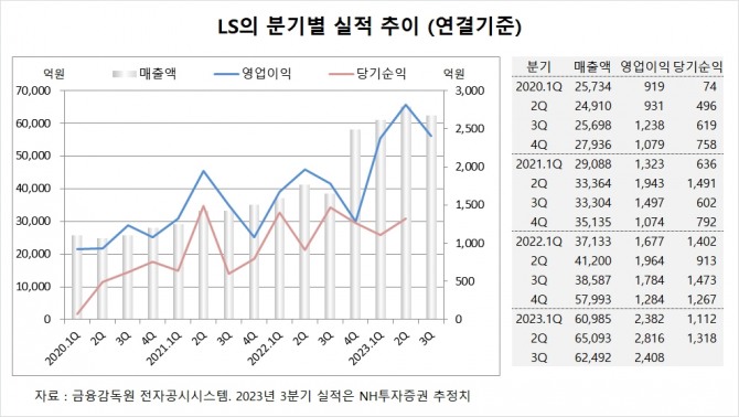 NH투자증권은 LS의 3분기 연결기준 매출액이 6조2492억원, 영업이익이 2408억원에 이를 것으로 내다봤다. 3분기 영업이익은 시장 컨센서스인 2700억원을 하회할 전망이다.
