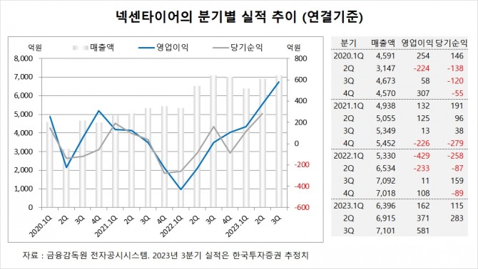 한국투자증권은 넥센타이어의 3분기 연결기준 매출액이 7101억원, 영업이익이 581억원에 이를 것으로 내다봤다. 3분기 영업이익은 시장 컨센서스인 520억원을 12.4% 상회할 전망이다.