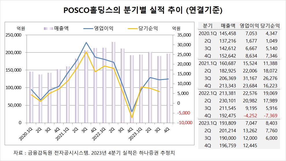 하나증권은 포스코홀딩스의 4분기 연결기준 매출액이 19조6759억원, 영업이익이 1조2445억원에 이를 것으로 전망했다.