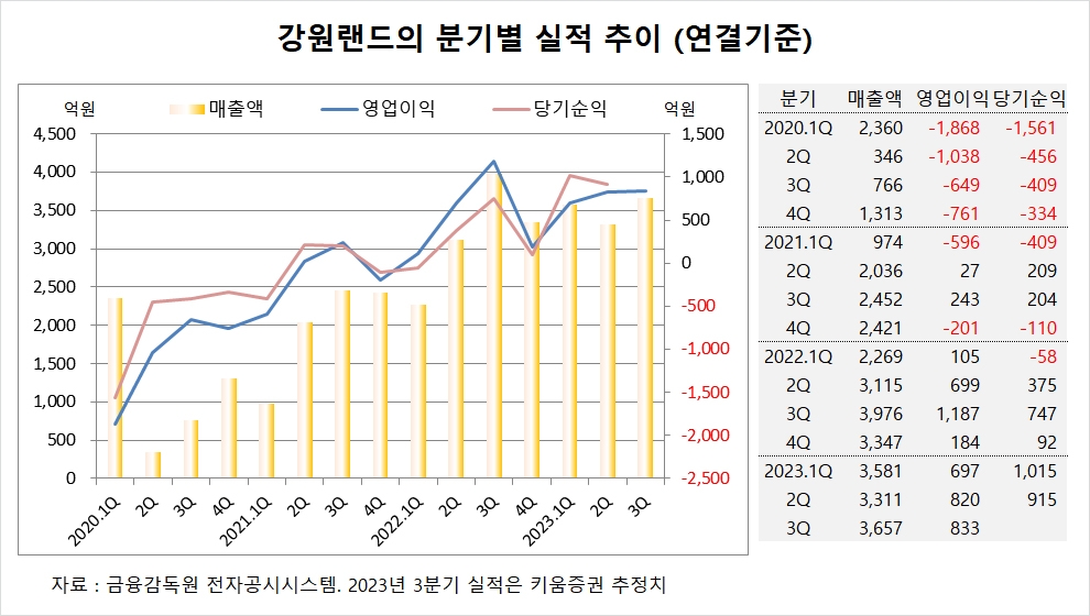 키움증권은 강원랜드의 3분기 연결기준 매출액이 3657억원, 영업이익이 833억원에 이를 것으로 내다봤다. 3분기 영업이익은 시장 컨센서스인 974억원을 하회할 전망이다.
