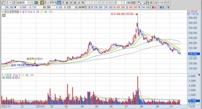 이미지 확대보기포스코퓨처엠의 주가는 25일 오전 9시 3분 현재 전일보다 9500원(3.11%) 내린 29만5500원에 거래되고 있다.