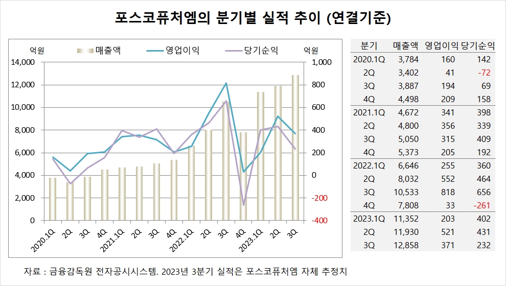 포스코퓨처엠은 올해 3분기 연결기준 매출액이 1조2858억원, 영업이익이 371억원, 당기순이익이 232억원을 기록했다고 공시했다. 3분기 영업이익은 시장 컨센서스인 669억원을 크게 하회했다.