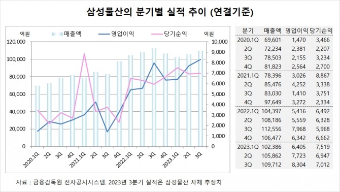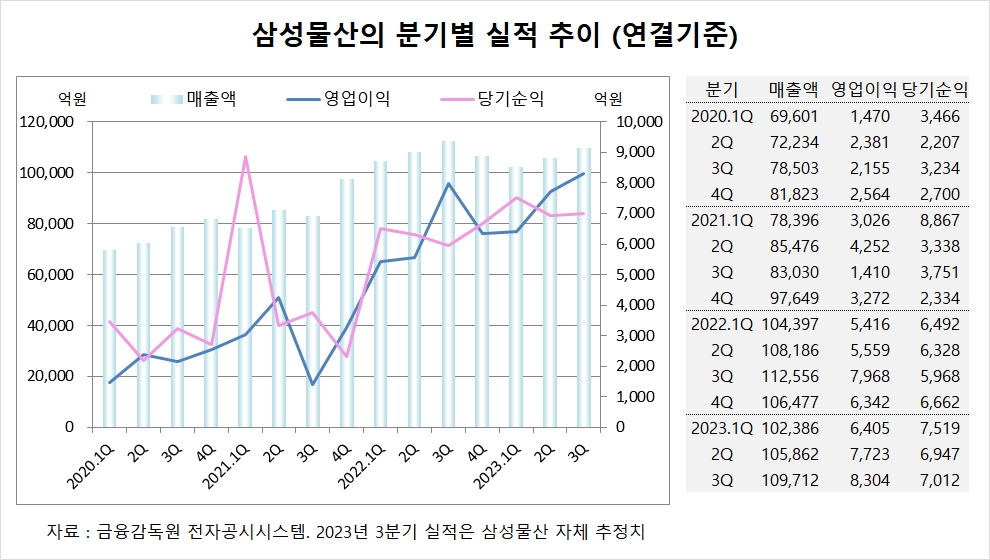 DS투자증권 김수현 연구원은 삼성물산의 3분기 실적이 호조를 보이는 데는 건설 부문 내 하이테크향 매출이 꾸준히 발생하고 있고 삼성전자 테일러 파운드리 관련 매출과 국내 반포 더 팰리스73 수주 등 국내 주택 부문이 양호하고 레저/식음료 부문과 자회사 삼성바이오로직스의 호실적에 기인한 것으로 분석했다.