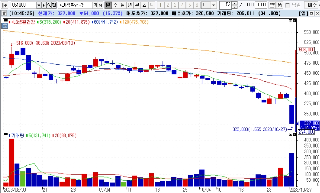 이미지 확대보기27일 한국거래소에 따르면 LG생활건강은 이날 오전 10시 31분 현재 유가증권시장에서 전 거래일 대비 16.87% 내린 32만5000원에 거래되고 있다.