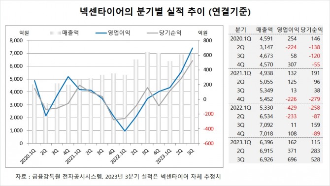하나증권은 넥센타이어가 3분기 외형 축소에도 불구하고 영업이익률이 대폭 상승한 10.1%를 기록하면서 2019년 3분기 이후 16개 분기 만에 두 자릿수로 회복됐고 지난 3년간 이익률 급락을 이끌었던 운반비가 정상화되었고 원재료 투입원가도 하락하면서 매출원가율이 11.2%포인트 개선된 것으로 진단했다.