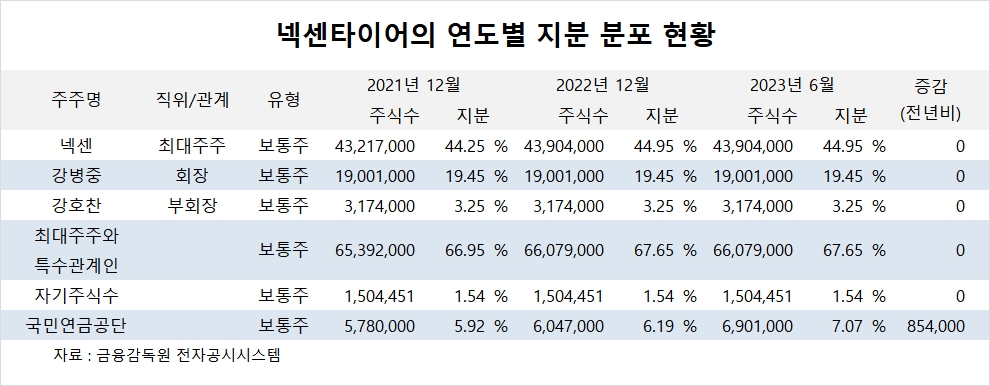 이미지 확대보기넥센타이어의 최대주주는 넥센으로 지분 44.95%를 보유하고 있다.