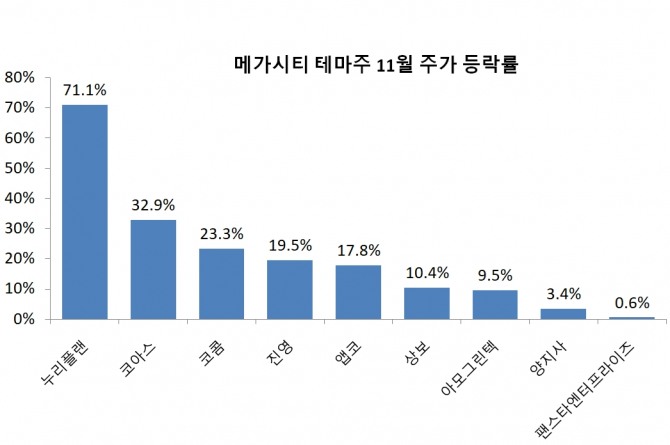 이외에도 코콤 23.3%, 상보 10.3%, 아모그린텍 9.5%, 양지사 3.3% 씩 오르면 11월들어 강세를 보이고 있다.