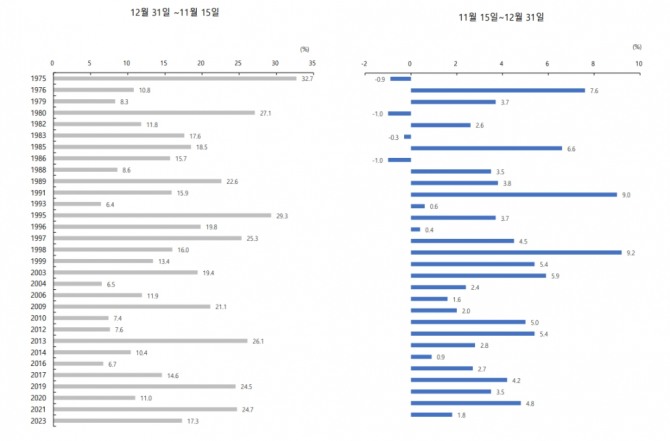 한편, 하이투자증권에 따르면 연초 이후 S&P500 지수가 5% 이상 상승할 경우 11월 15일 이후 연말까지 상승했다. 지난 50년으로 시계열을 넓혀도 같은 조건이 발생한 30번의 사례 중 4번을 제외하고 모두 산타랠리가 나타났다.