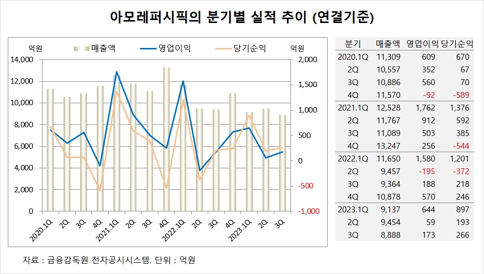 현대차증권은 아모레퍼시픽의 올해 연결기준 매출액이 3조7930억원, 영업이익이 1270억원, 당기순이익이 1520억원에 달할 것으로 추정했다.