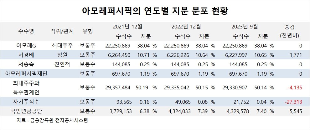이미지 확대보기아모레퍼시픽의 최대주주는 아모레G(아모레퍼시픽그룹)로 지분 38.04%를 보유하고 있다.