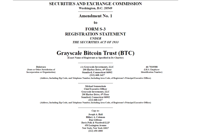 22일(이하 현지시간) 블룸버그 등 다수 외신에 따르면, 그레이스케일이 미국 증권거래위원회(SEC)와의 회담 후 약 3일 만에 비트코인(BTC) 현물 상장지수펀드(ETF) 신청서 수정안을 제출했다.