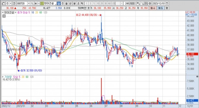 이미지 확대보기현대건설의 주가는 1일 오전 9시 3분 현재 전일보다 250원(0.70%) 오른 3만6100원에 거래되고 있다.