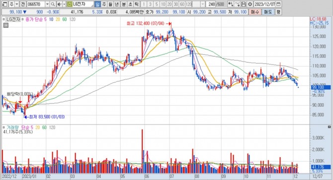 이미지 확대보기LG전자의 주가는 7일 오전 9시 3분 현재 전일보다 900원(0.90%) 내린 9만9100원에 거래되고 있다.