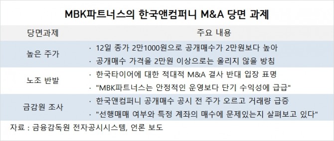 MBK파트너스의 가장 큰 당면 과제는 한국앤컴퍼니의 현재 주가가 공개매수 가격을 웃도는 것이라 할 수 있다. 벤튜라연합이 공동계약서를 체결한 날자는 11월 30일이지만 12월 5일 공시가 되면서 한국앤컴퍼니 주가가 급등해 공개매수 가격인 2만원을 훌쩍 넘겼기 때문이다.