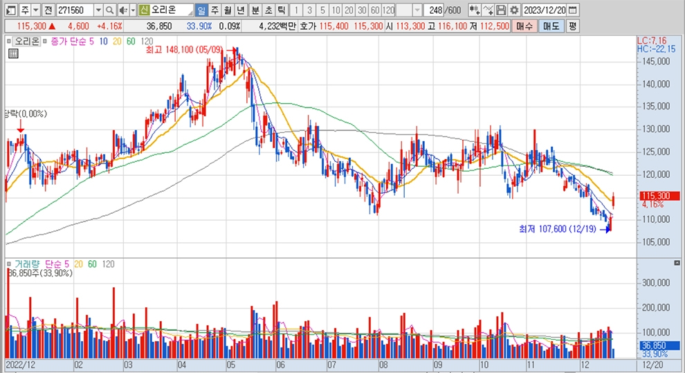 이미지 확대보기오리온의 주가는 20일 오전 9시 10분 현재 전일보다 4600원(4.16%) 오른 11만5300원에 매매되고 있다.