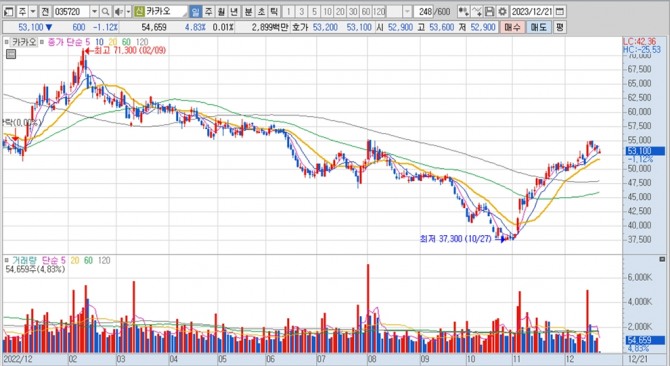 이미지 확대보기카카오의 주가는 21일 오전 9시 3분 현재 전일보다 600원(1.12%) 내린 5만3100원에 거래되고 있다.