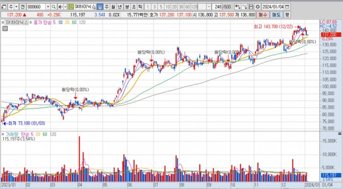 이미지 확대보기SK하이닉스의 주가는 4일 오전 9시 3분 현재 전일보다 400원(0.29%) 오른 13만7200원에 거래되고 있다.