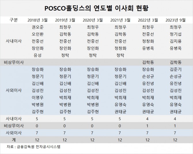 포스코홀딩스 이사회에서 포스코홀딩스 경영활동을 감독해야 하는 사외이사들조차 반대의견이 단 한 건도 없어 사외이사들이 사실상 ‘거수기’ 역할을 한 것이 아니냐는 비난도 나오고 있다.