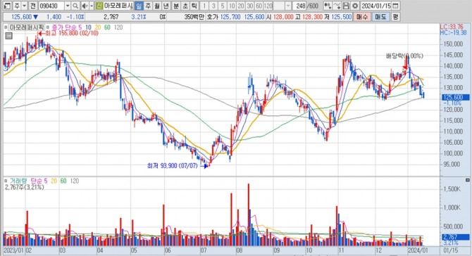 이미지 확대보기아모레퍼시픽의 주가는 15일 오전 9시 3분 현재 전일보다 1400원(1.10%) 내린 12만5600원에 거래되고 있다.