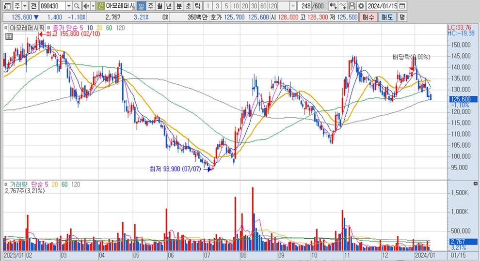 상상인증권은 아모레퍼시픽이 지난해 글로벌 리오프닝에 따른 화장품 업종의 호황기였으나 중국 영향이 크게 남아있었던 대형 브랜드는 이러한 수혜에서 다소 소외된 측면을 고려해 아모레퍼시픽에 대해 투자의견 매수와 목표주가 16만원을 그대로 유지했다.