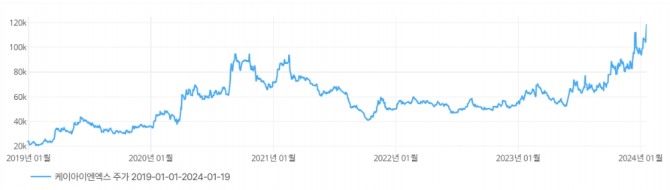 이미지 확대보기19일 인터넷 인프라 업체 케이아이엔엑스 주가는 이날 전일 대비 7.59% 급등한 11만9000원으로 장을 마쳤다. 지난해 하반기부터 본격 상승 흐름을 타기 시작해 역대 최고치를 지속 경신했다.