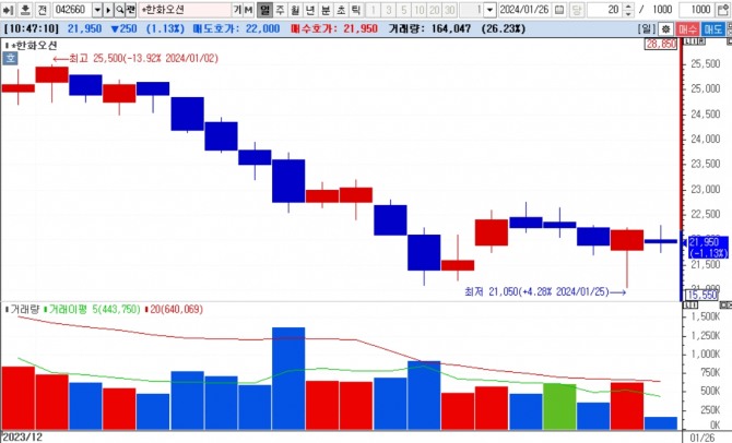 이미지 확대보기26일 한국거래소에 따르면 오전 10시 39분 현재 한화오션 주가는 전날보다 0.68% 떨어진 2만2050원에 거래되고 있다.
