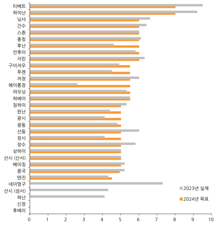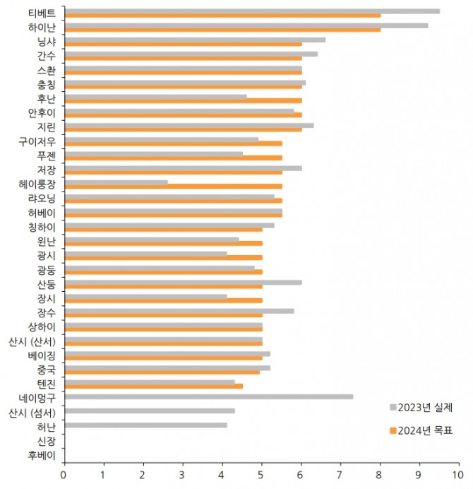 지역별로는 톈진을 제외한 모든 지역에서 5% 이상 목표를 제시했다. 그간 중앙정부는 지방정부 대비 목표치를 낮게 설정한 만큼 지방정부 평균치를 넘어서진 않을 것으로 보인다. 다만, 최소 5% 이상을 목표로 하는 수치를 제시할 것으로 관측된다.