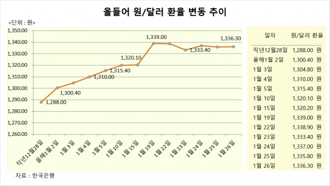 원/달러 환율은 지난해 말 달러당 1288.00원에서 지난 26일 달러당 1336.30으로 48.30원 올랐다.