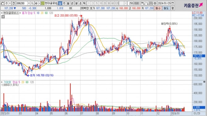 이미지 확대보기현대글로비스의 주가는 29일 오전 9시 3분 현재 전일보다 500원(0.30%) 내린 16만7200원에 거래되고 있다.