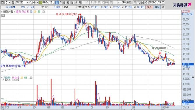 이미지 확대보기애경산업의 주가는 29일 오전 9시 10분 현재 전일보다 270원(1.56%) 내린 1만6990원에 매매되고 있다.