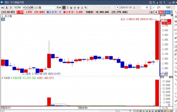 이미지 확대보기30일 한국거래소에 따르면, 신스틸 주가는 이날 오후 1시 20분 현재 전 거래일 대비 29.86% 상승한 3805원에 거래되고 있다.