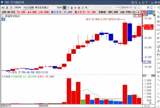 이미지 확대보기31일 한국거래소에 따르면, 롯데정보통신 주가는 이날 오전 9시 30분 현재 전 거래일 대비 10.78% 상승한 5만1400원에 거래되고 있다.