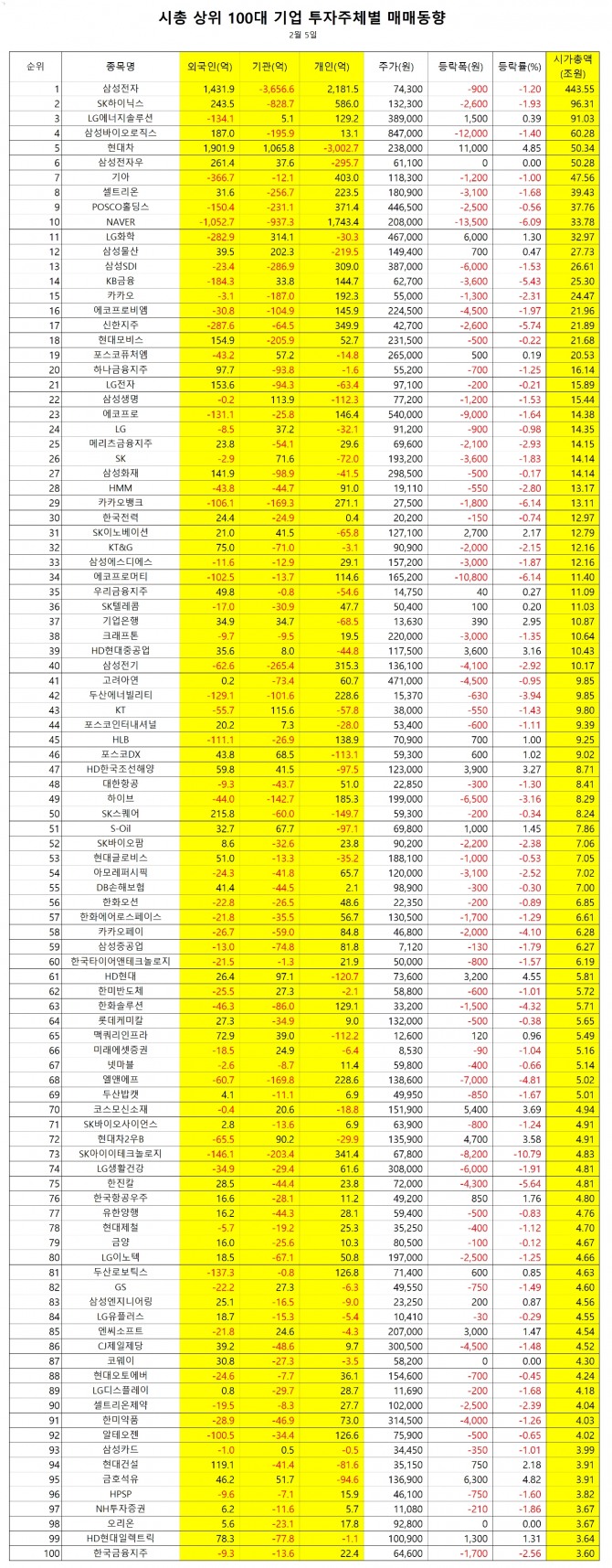 1위 삼성전자 2182억원(295만주), 2위 NAVER 1743억원(83만주), 3위 SK하이닉스 586억원(44만주), 4위 기아 403억원(34만주), 5위 POSCO홀딩스 371억원(8만주), 6위 신한지주 350억원(83만주), 7위 SK아이이테크놀로지 341억원(49만주), 8위 삼성전기 315억원(23만주), 9위 삼성SDI 309억원(8만주), 10위 HD현대인프라코어 289억원(351만주), 11위 카카오뱅크 271억원(98만주), 12위 두산에너빌리티 229억원(147만주), 13위 셀트리온 224억원(12만주), 14위 카카오 192억원(35만주), 15위 하이브 185억원(9만주), 16위 KB금융 145억원(23만주), 17위 LG에너지솔루션 129억원(3만주), 18위 한화솔루션 129억원(39만주), 19위 두산로보틱스 127억원(18만주), 20위 에코프로머티 115억원(7만주)