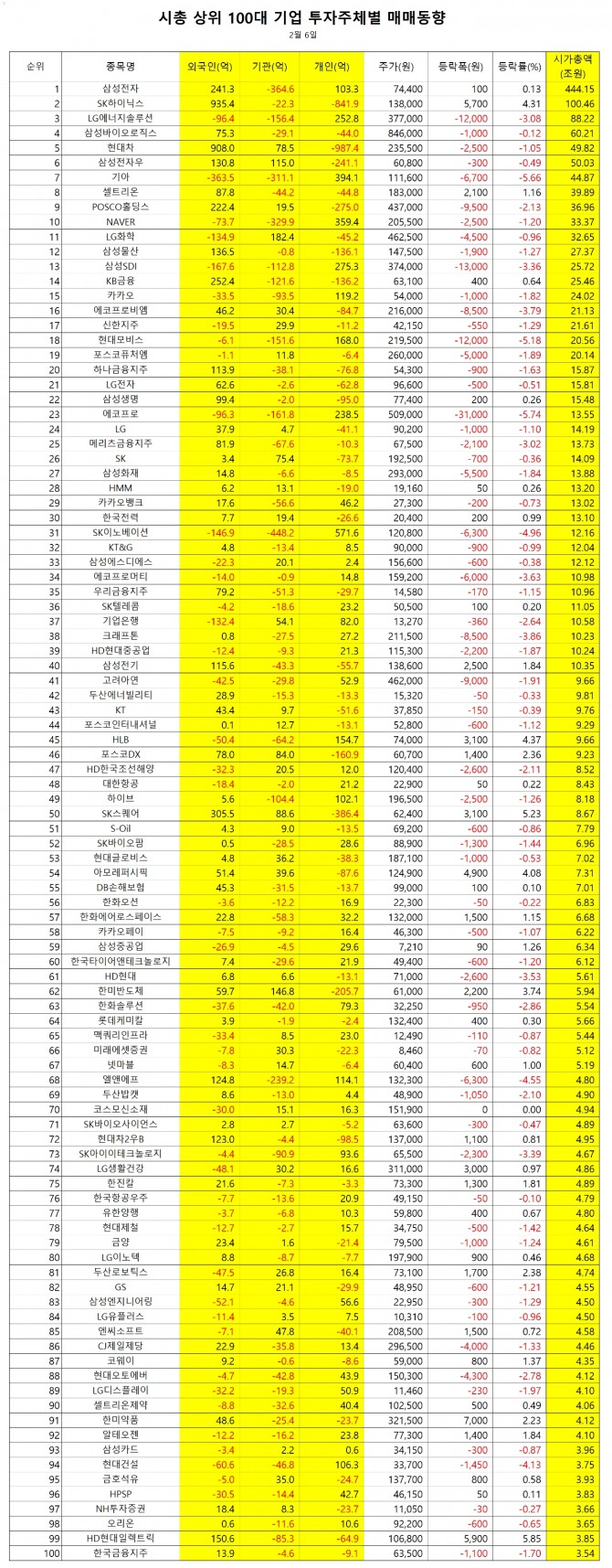 [외국인] 유가증권시장 순매수 상위종목(6일)