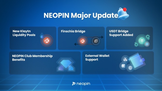 이미지 확대보기네오핀은 클레이튼과 핀시아 통합 생태계 확장 및 공략에 올인하기 위해 지난 15일 △핀시아(FNSA)와 클레이튼(KLAY) 네트워크 간 전환 브릿지 △클레이튼과 스테이블코인(USDT) 간 전환 브릿지 △네오핀 외 메타마스크, 카이카스, 도시 볼트 지갑 지원 확대 △활동점수에 따라 예치된 클레이튼, 핀시아, 트론(TRX) 등의 가상자산에 연간이자율(APR, Annual Percentage Rate)을 추가로 제공하는 멤버십 등 대대적인 메이저 업데이트를 마쳤다.