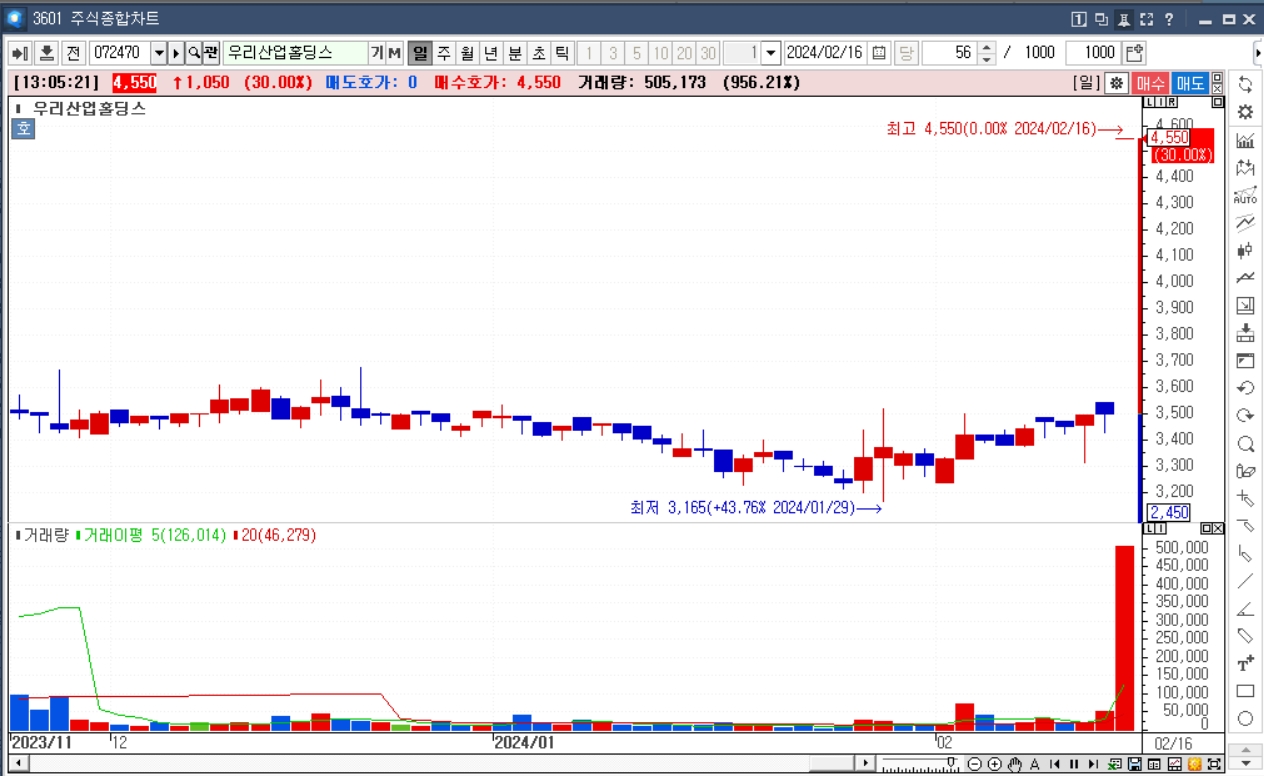이미지 확대보기16일 한국거래소에 따르면, 우리산업홀딩스 주가는 이날 오후 2시 57분 현재 전 거래일 대비 30% 상승한 4550원에 거래되고 있다.