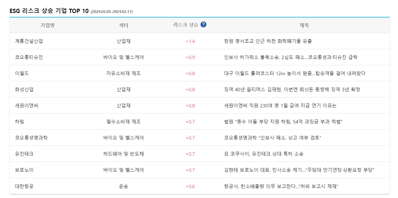 이외에도 하림, 코오롱생명과학, 유진테크, 보로노이, 대항항공도 +0,6점 이상으로 ESG 리스크 상승 TOP 10에 포함됐다.