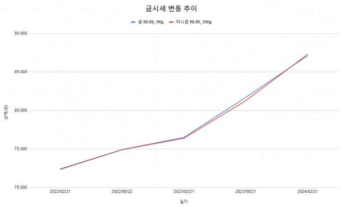 이미지 확대보기한국거래소에 따르면 21일 2시 5분 현재 금 순도 99.99% 1Kg 상품은 8만7190원, 미니금 99.99% 100g은 8만7260원으로 최근 1년간 각각 1만440원(13.60%), 1만610원(13.84%) 상승했다.